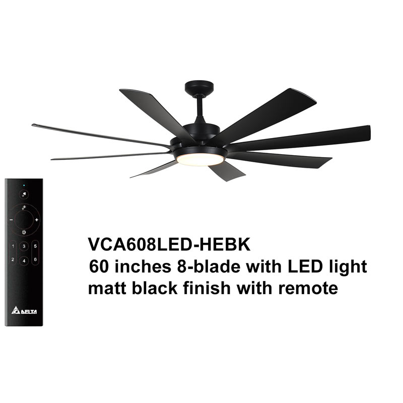 Breez RioVista VCA608LED-HEWH and VCA608LED-HEBK are 60 inch, 8-blade ceiling fans with light and remote Control. The RioVista ceiling fan is available in two color options, matt white or matt black. These ceiling fans can be installed in many different spaces, such as the living rooms, dining rooms, bedrooms, and wet locations such as a patio or lanai. Light commercial application include restaurants, offices, hotels, and resorts.